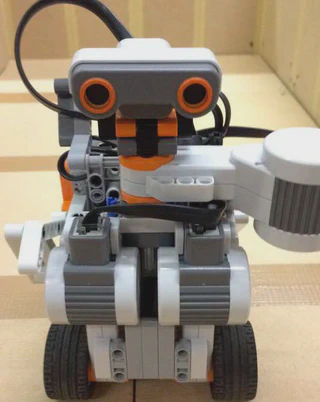 The robot was limited to using a single ultrasound sensor, an odometry sensor and two motors. The robot was designed and built to represent the simulated robot as accurately as possible. This was achieved by positioning the ultrasound sensor directly above the turning centre, located in the middle of the two motors. In theory this configuration enabled the robot to turn without displacing the sensor, although in reality this is unlikely.