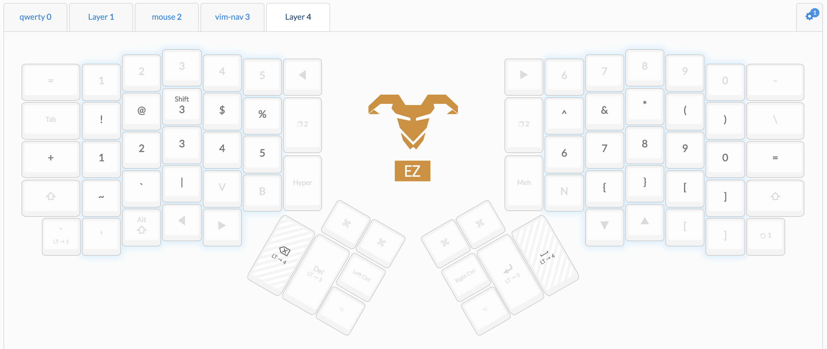 My favourite feature of the ErgoDox EZ is the ability to configure different layers. I’ve included photos of the layers I’m currently using below. Keys can have different behaviours depending on wether they have been pressed or held. For example, in my main layer on the thumb cluster the space, enter, delete and backspace keys are used to activate other layers when held. You can also configure the keyboard so that double tapping a key is equivalent to holding it. For example, in my main layer the backspace can be held by double tapping. This is needed as holding it will activate layer 4.