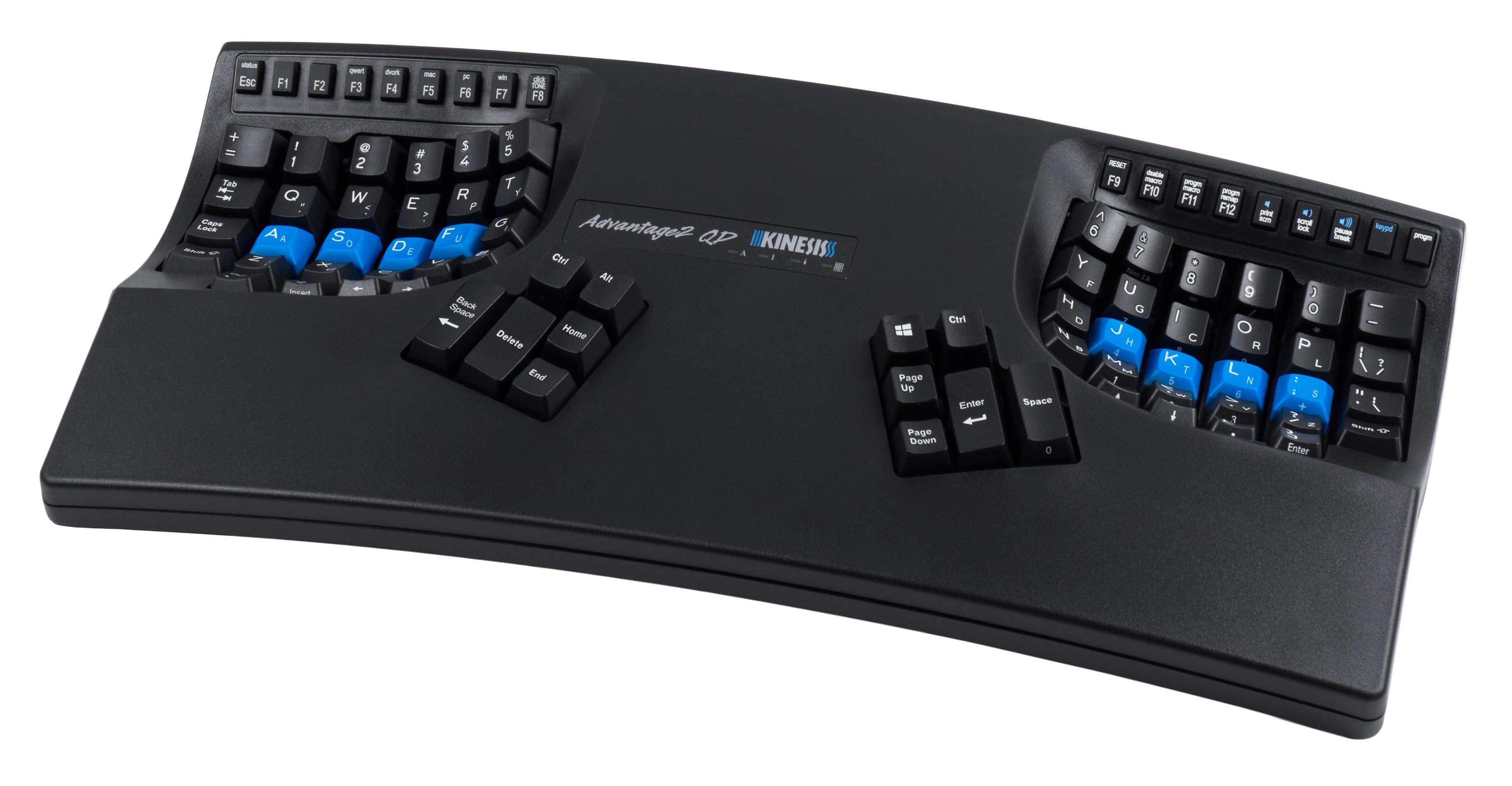 Weeks of reading blog posts and reddit (r/MechanicalKeyboards, r/ErgoMechKeyboards) inevitably led me to the Kinesis Advantage 2. This keyboard is a bit of a bank breaker but is probably one of, if not the best, ergonomoic keyboards on the market for touch typists (though anyone can buy it and learn to touch type like I did).