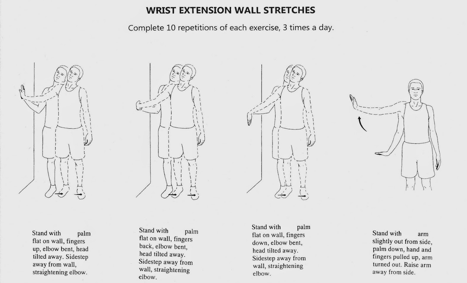 The best exercises that I’ve noticed alleviate the most pain are wrist extensions against a wall and wrist extensors the other way.Image from [HB Hands](http://www.handshb.com/2014/07/wrist-extension-wall-stretches.html)